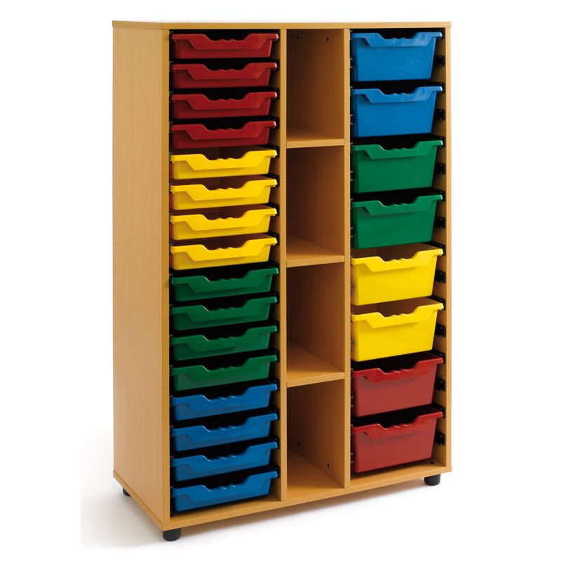47408B: ¡Equipa tu espacio de trabajo y mantén el orden con este gavetero! - Realizado en madera de alta calidad. - Tablero de melamina de haya de 19 mm. - Incluye 16 cubetas simples, 8 cubetas dobles y cuatro huecos en el centro. - Cubetas en plástico resistente con colores surtidos. - Con niveles en las patas para elevar el mueble. - Estructura del mueble en blanco. - Elige el color de las baldas. - Medidas: 40 cm x 90 cm x 148 cm de alto. Especificaciones: PLAZO DE ENTREGA APROXIMADAMENTE 1-2 SEMANAS. Se sirve montado. Garantía del mobiliario: 5 años por defecto de fabricación.
