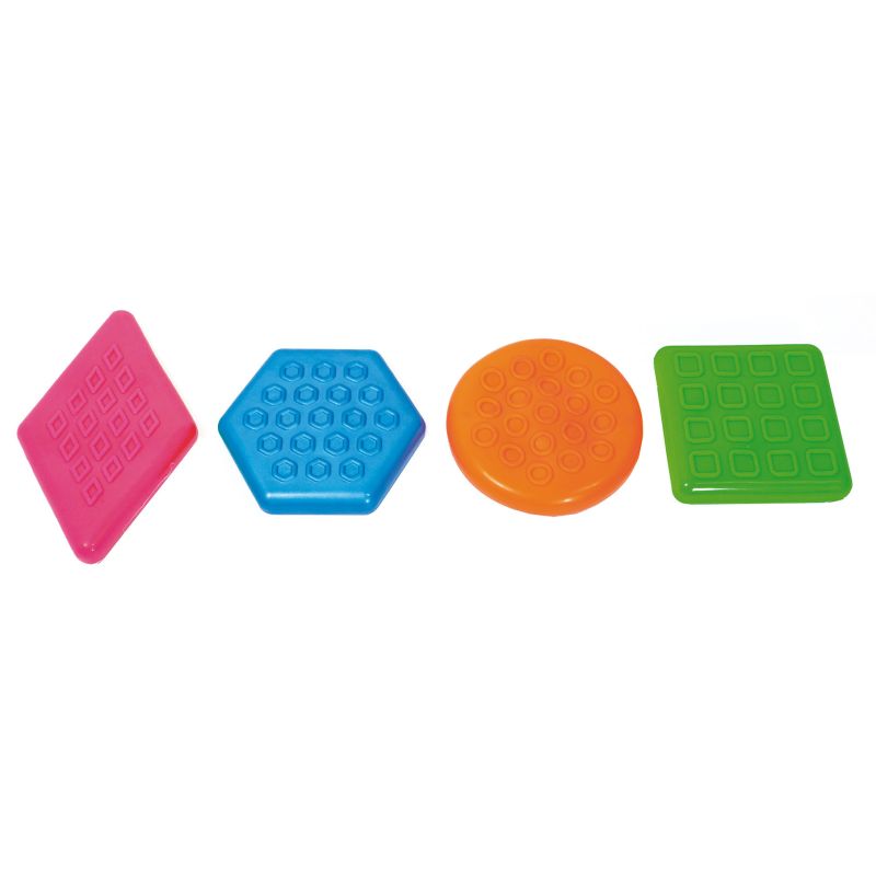 4 piezas de termoplástico resistente con diferentes formas: círculo, cuadrado, rombo y hexágono.