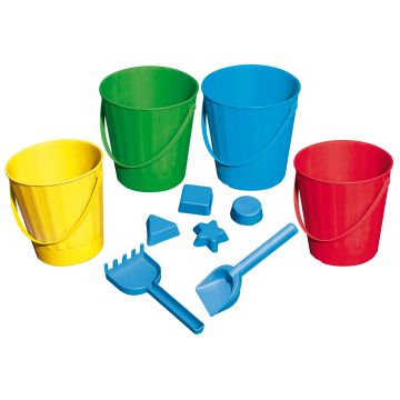 0402064A: ¡Trabaja la arena y realiza diferentes actividades con estos kit de cuatro piezas! - Fomentan la coordinación y la motricidad. - Estimula la imaginación y la creatividad. - Desarrolla el juego simbólico. - Favorece la socialización y el trabajo cooperativo. Especificaciones: Realizados en plástico robusto. Packs unicolores de: 5 cubos de 16,5 cm de altura. 5 tamices de 16,5 cm de diámetro. 5 palas de 23 cm de longitud.