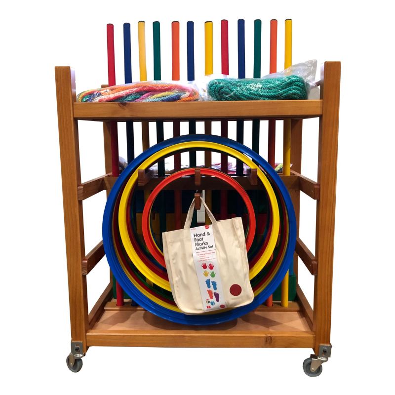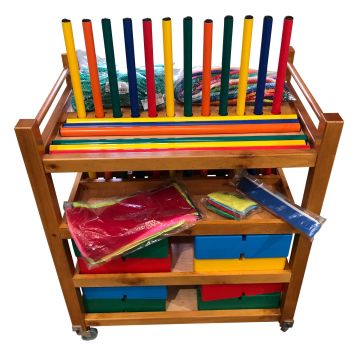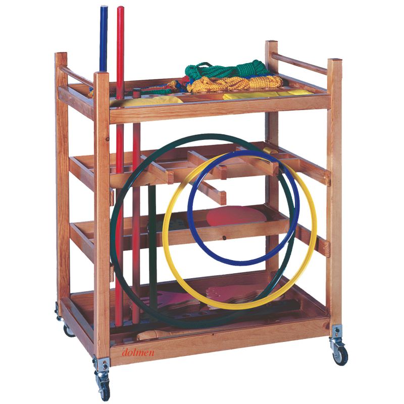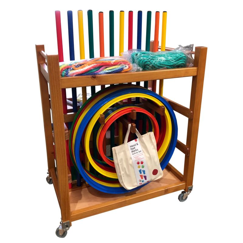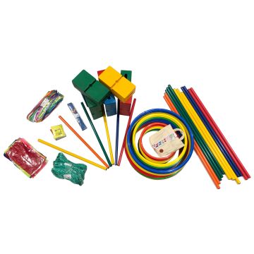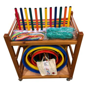 203068: Contiene: - 10 aros de 36 cm. - 12 aros de 50 cm. - 12 aros de 61 cm. - KIT completo manos y pies que incluye 12 manos de 15 cm. y 12 pies de 20 cm. y dos dados de espuma con número y colores. - 10 picas de 1 metro. - 5 picas de 70 cm. - 4 saquetes de colores de 12 cm. de 100 gr. -6 soportes de aro/pic de 30x15x10 cm. - 5 cintas raso de 3 metros. - 3 cuerdas verdes de polipropileno de 10 metros y 9 mm. de grosor. -10 cuerdas en nailon de 3 metros de longitud y 9 mm. de grosor. Carro de 95x78x52 cm. realizado en madera de pino barnizado con apartados para clasificar los materiales. Con ruedas para facilitar su transporte.