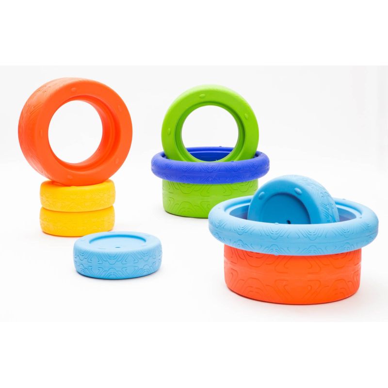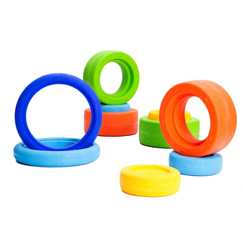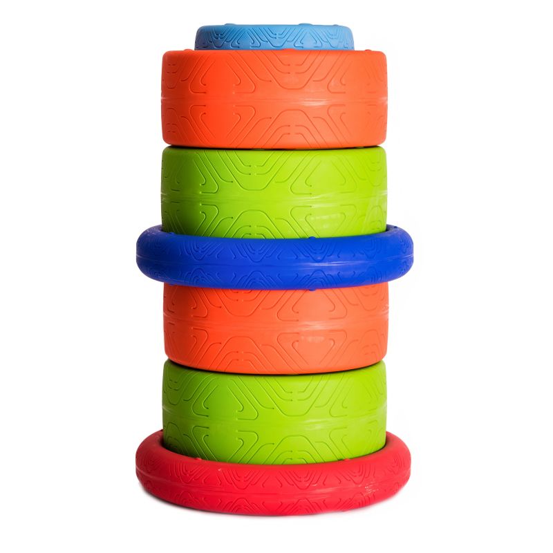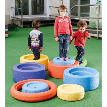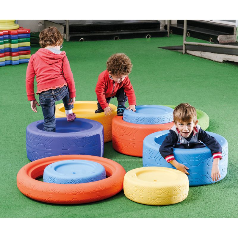 Compuesto por 4 ruedas de 40 cm. de diametro, 4 ruedas con hueco de 60 cm. de diametro y 2 ruedas con hueco de 76 cm. de diametro. Para crear largos caminos con diferentes posibilidades de construccion. En plástico semírigido resistente y estable. Las ruedas se pueden apilar. Con 5 años de garantia.