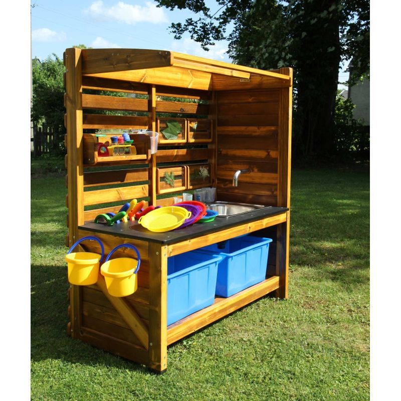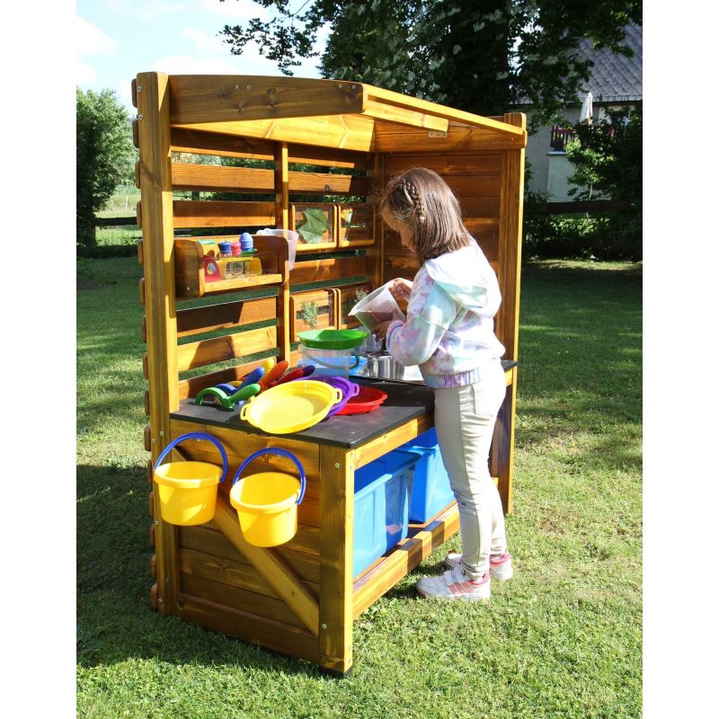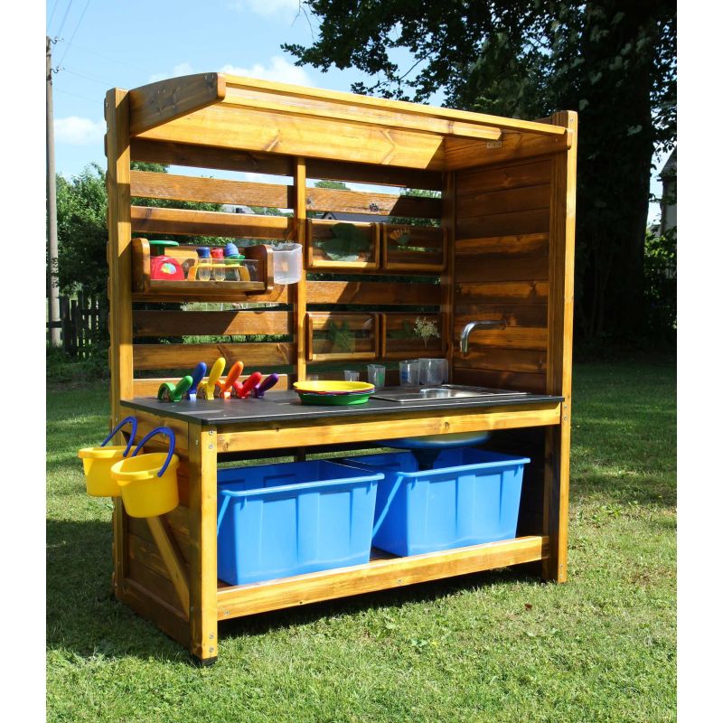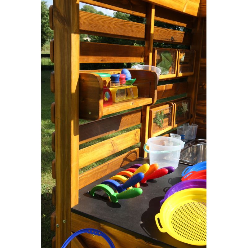 - Incluye: grifo de agua con bomba de agua, 3 vasos medidores realizados en plástico, 16 fichas con objetos de la naturaleza, set de 6 lupas, cajas transparentes para rellenar con hojas y cualquier elemento, 3 cubos, balanza con vaso de medición, pipetas, tubos de ensayo y 5 tamices.
