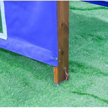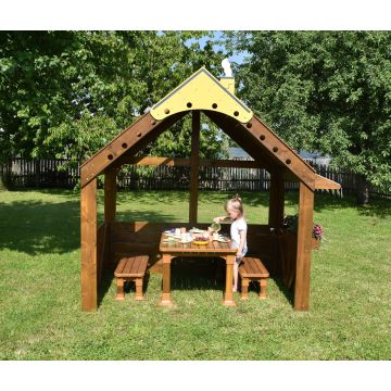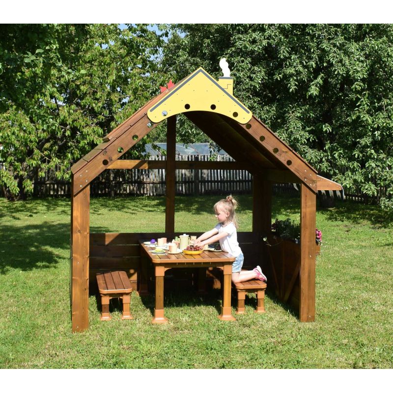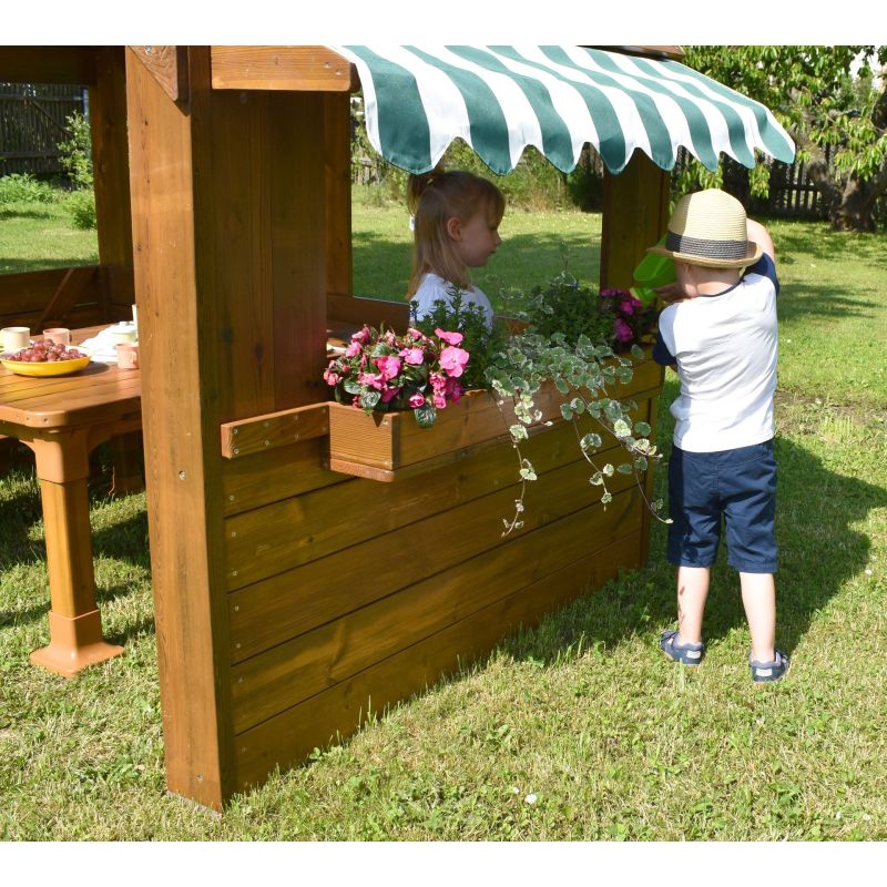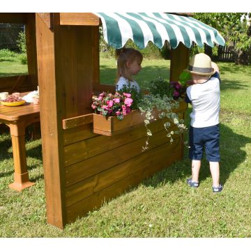 405011: ¡Juega sin parar en esta fantástica casita de juegos para exterior! - Favorece la motricidad y la coordinación. - Desarrolla el juego simbólico. - Favorece la socialización y la autonomía. - Estimula la imaginación y la creatividad. - Incluye: ventanas en el techo y en los laterales, toldo resistente, carteles de decoración, pizarra y macetas. - NO incluye mesa y bancos. Especificaciones: Realizada en madera de pino. Medidas: 230 cm de ancho x 154 cm de largo x 220 cm de alto. Garantía de 5 años. Para cumplir la normativa de seguridad de juegos de exterior: EN 1176. Se necesitan ganchos de anclaje según el suelo donde se vaya a instalar: cemento o césped.