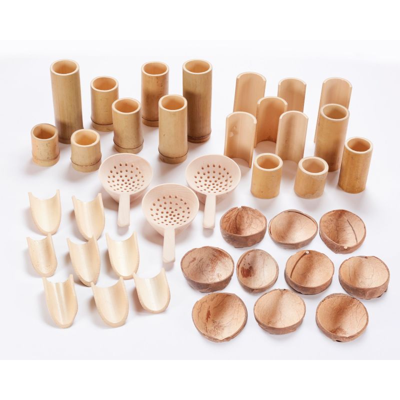 Contenido: palas, coladores, cuencos y ollas de bambú.
